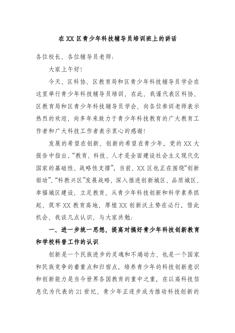 / 在区青少年科技辅导员培训班上的讲话