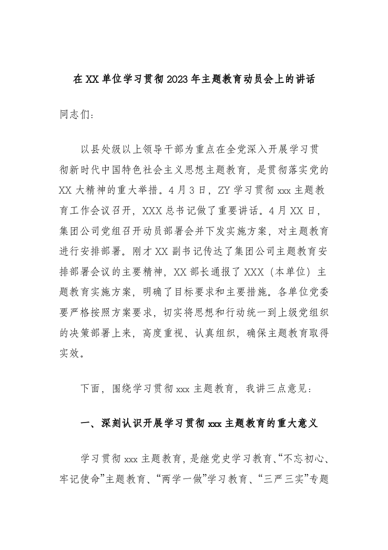 / 在单位学习贯彻2023年主题教育动员会上的讲话
