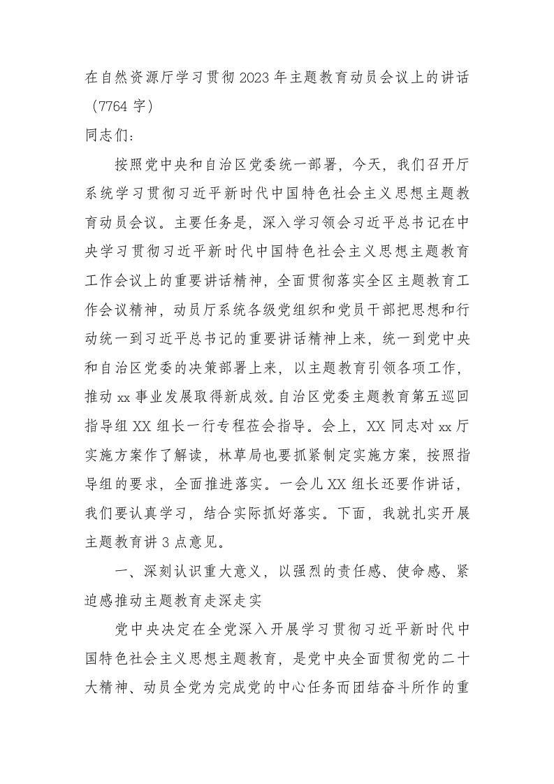 在厅2023年学习贯彻主题教育动员部署会上的讲话