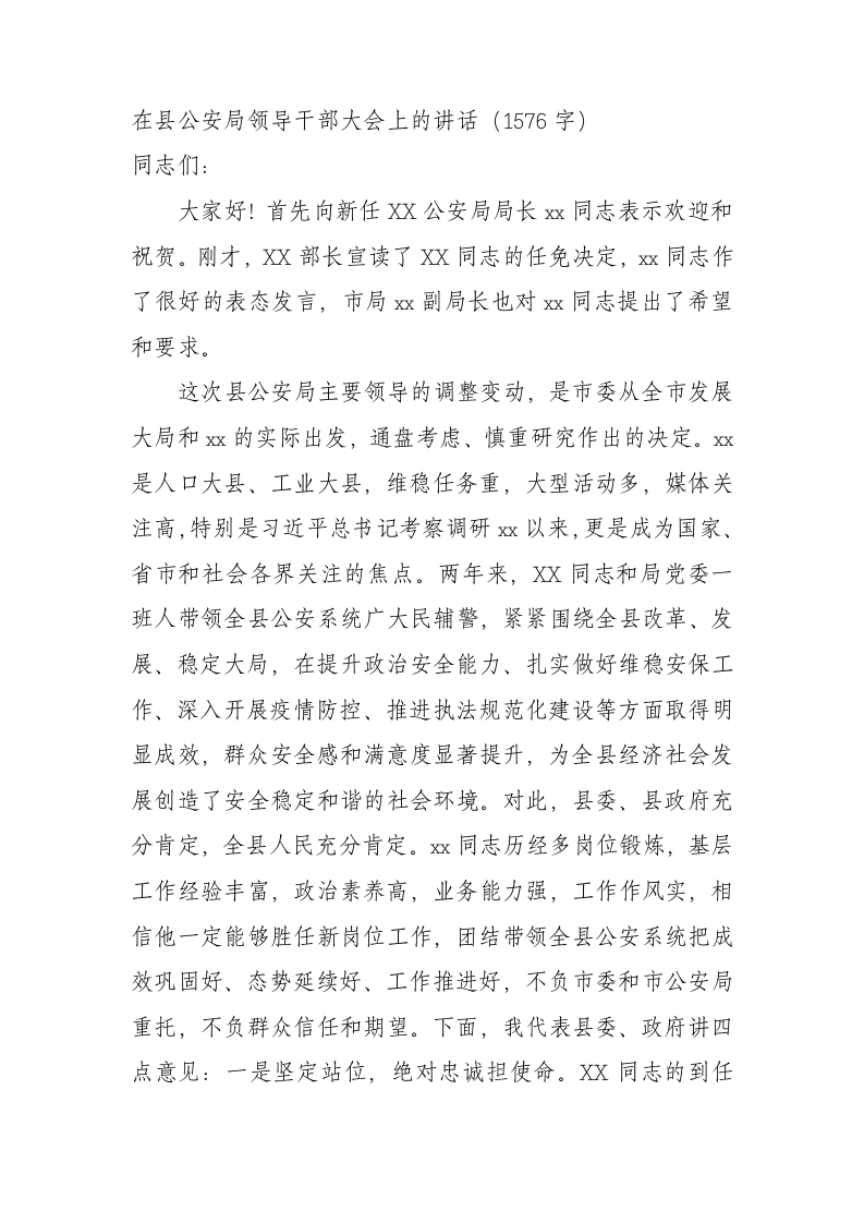 / 在县公安局领导干部大会上的讲话(新任职局长)