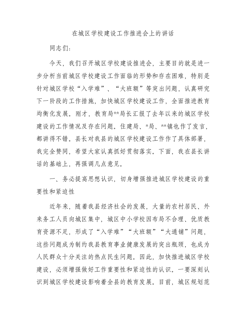 / 在城区学校建设工作推进会上的讲话