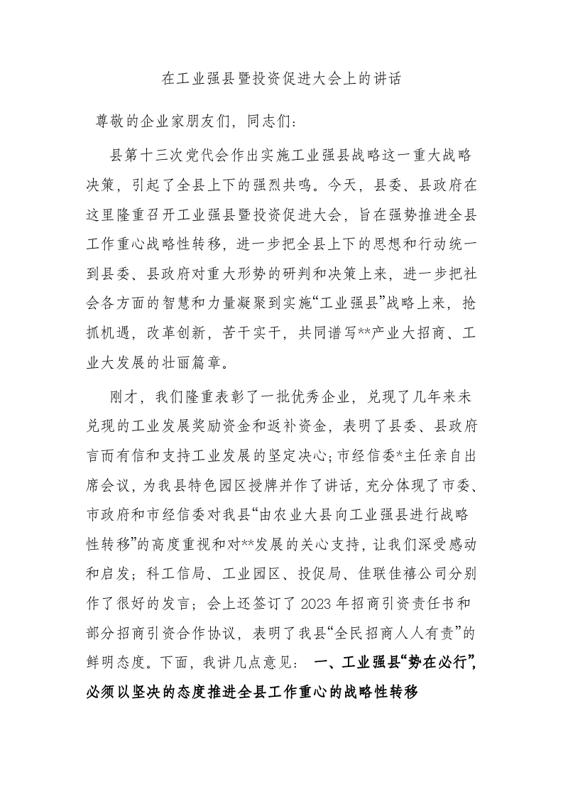 在工业强县暨投资促进大会上的讲话