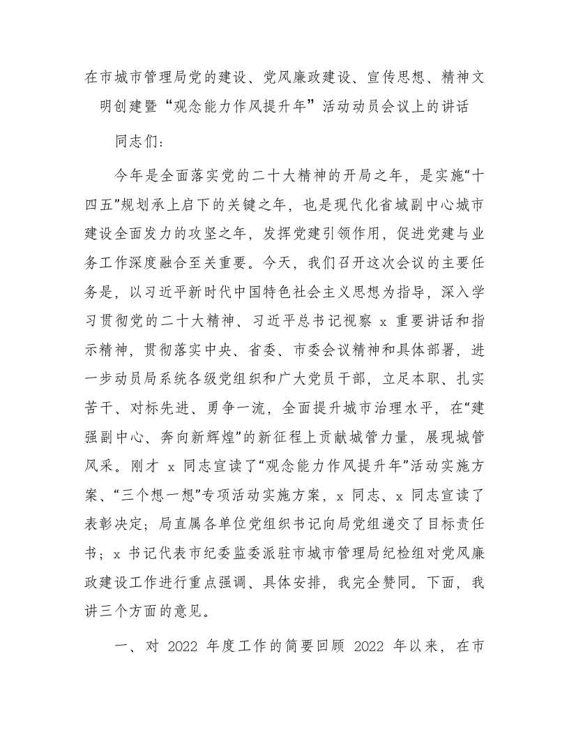 / 在市城管系统党的建设、党风廉政建设、宣传思想、精神文明创建暨“观念能力作风提升年”活动动员会议上的讲话