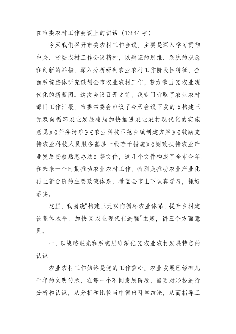 / 在市委农村工作会议上的讲话