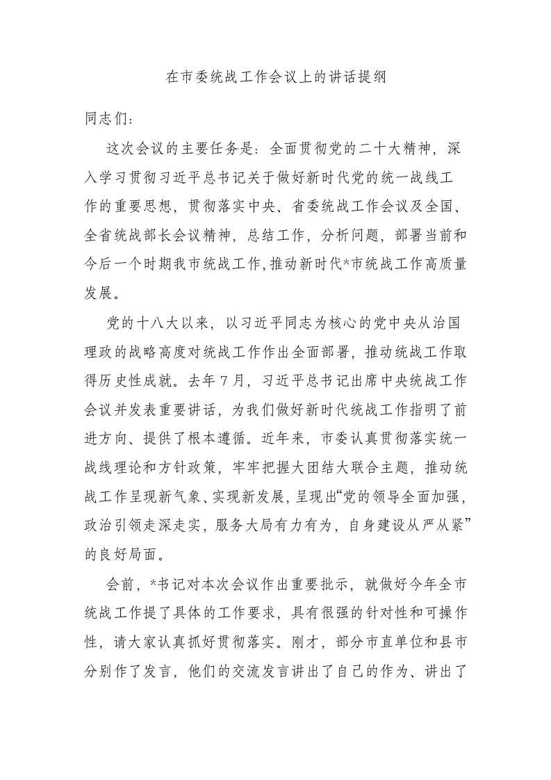 / 在市委统战工作会议上的讲话提纲
