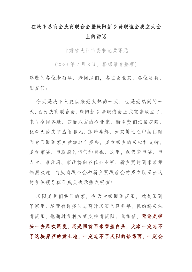 在庆阳总商会庆商联合会暨庆阳新乡贤联谊会成立大会上的讲话