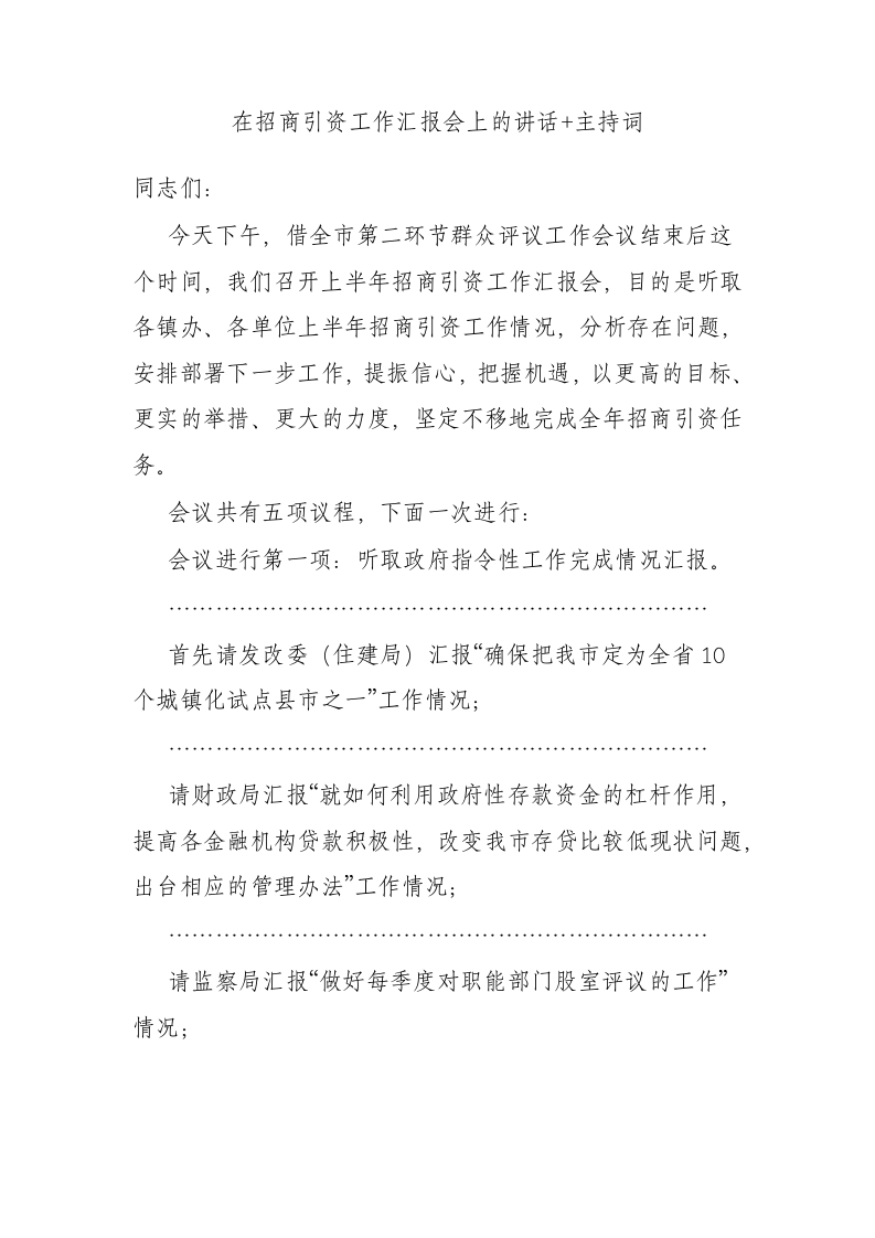 / 在招商引资工作汇报会上的讲话+主持词