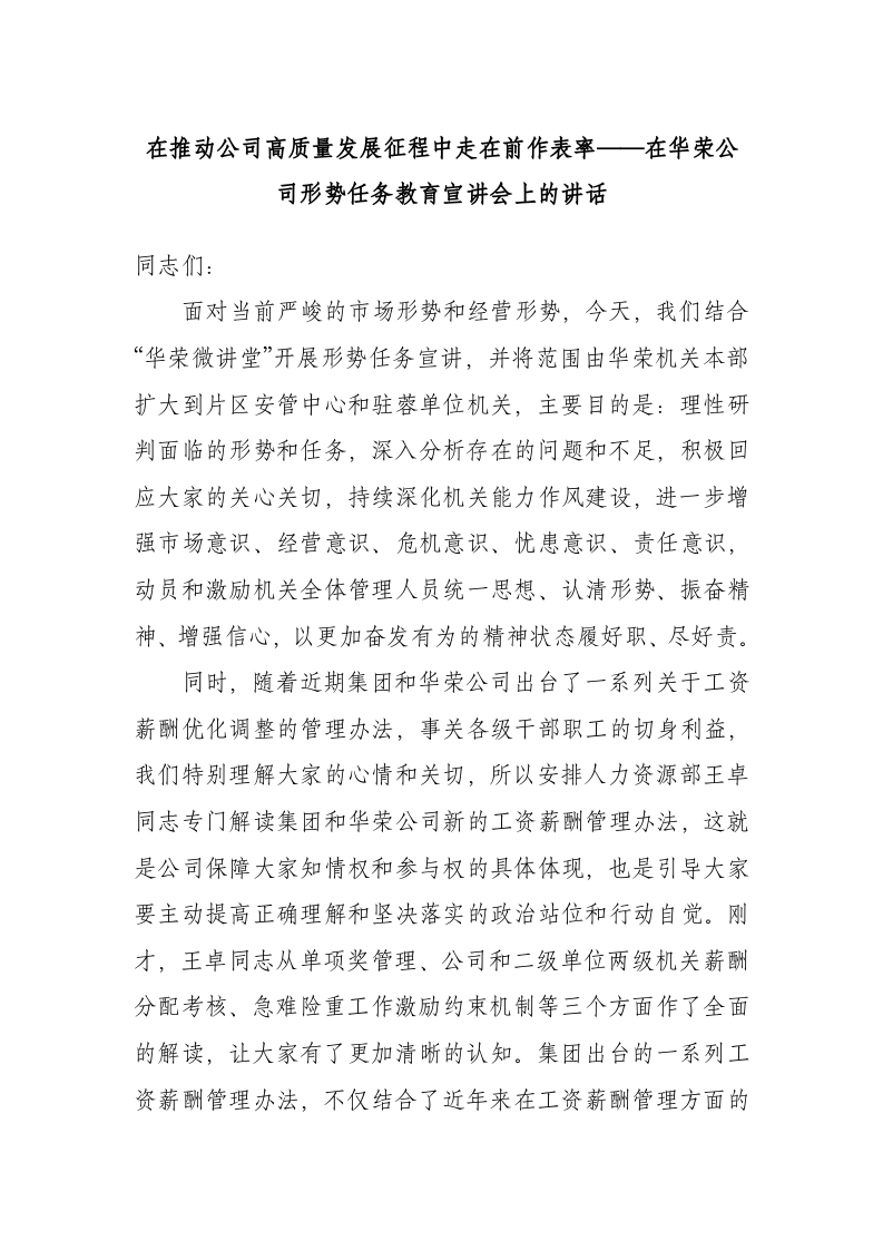 / 在推动公司高质量发展征程中走在前作表率——在华荣公司形势任务教育宣讲会上的讲话
