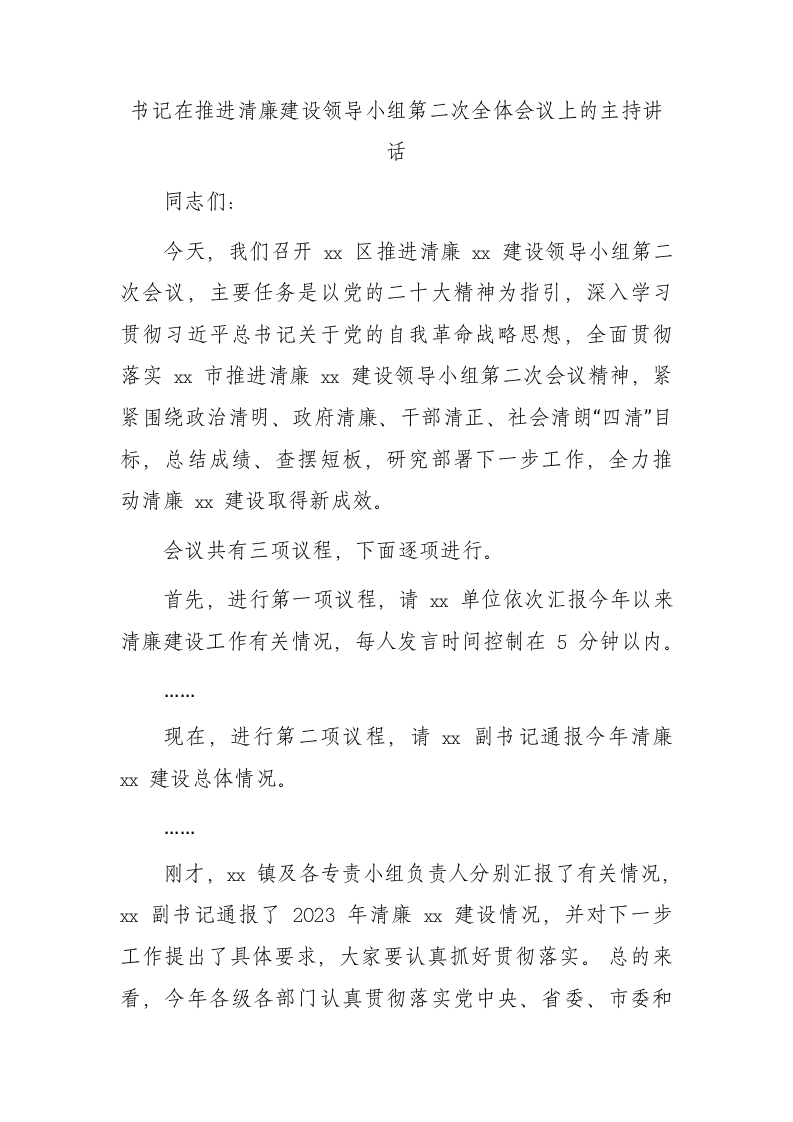 在推进清廉建设领导小组第二次全体会议上的主持讲话