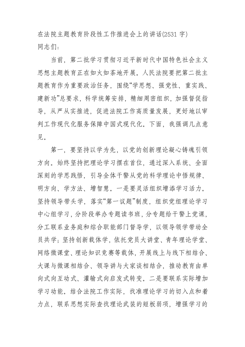 在法院主题教育阶段性工作推进会上的讲话2500字