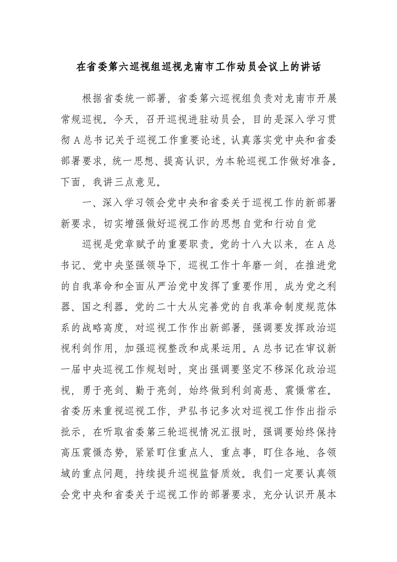 在省委第六巡视组巡视龙南市工作动员会议上的讲话