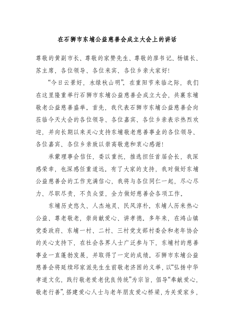 在石狮市东埔公益慈善会成立大会上的讲话