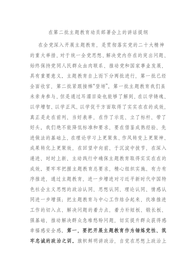 / 在第二批XX教育动员部署会上的讲话提纲