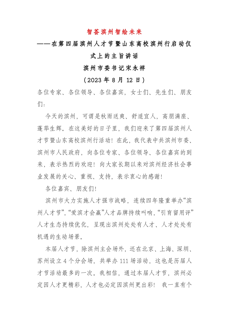/ 在第四届滨州人才节暨山东高校滨州行启动仪式上的主旨讲话