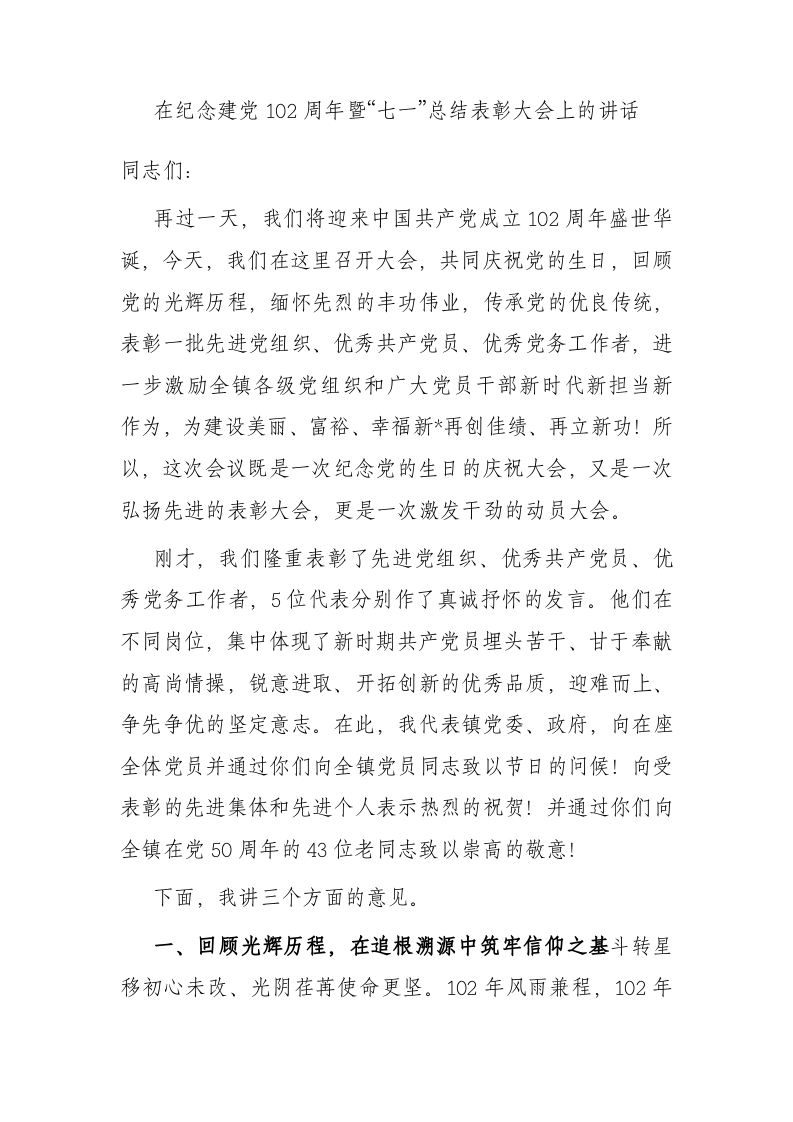 在纪念建党102周年暨“七一”总结表彰大会上的讲话