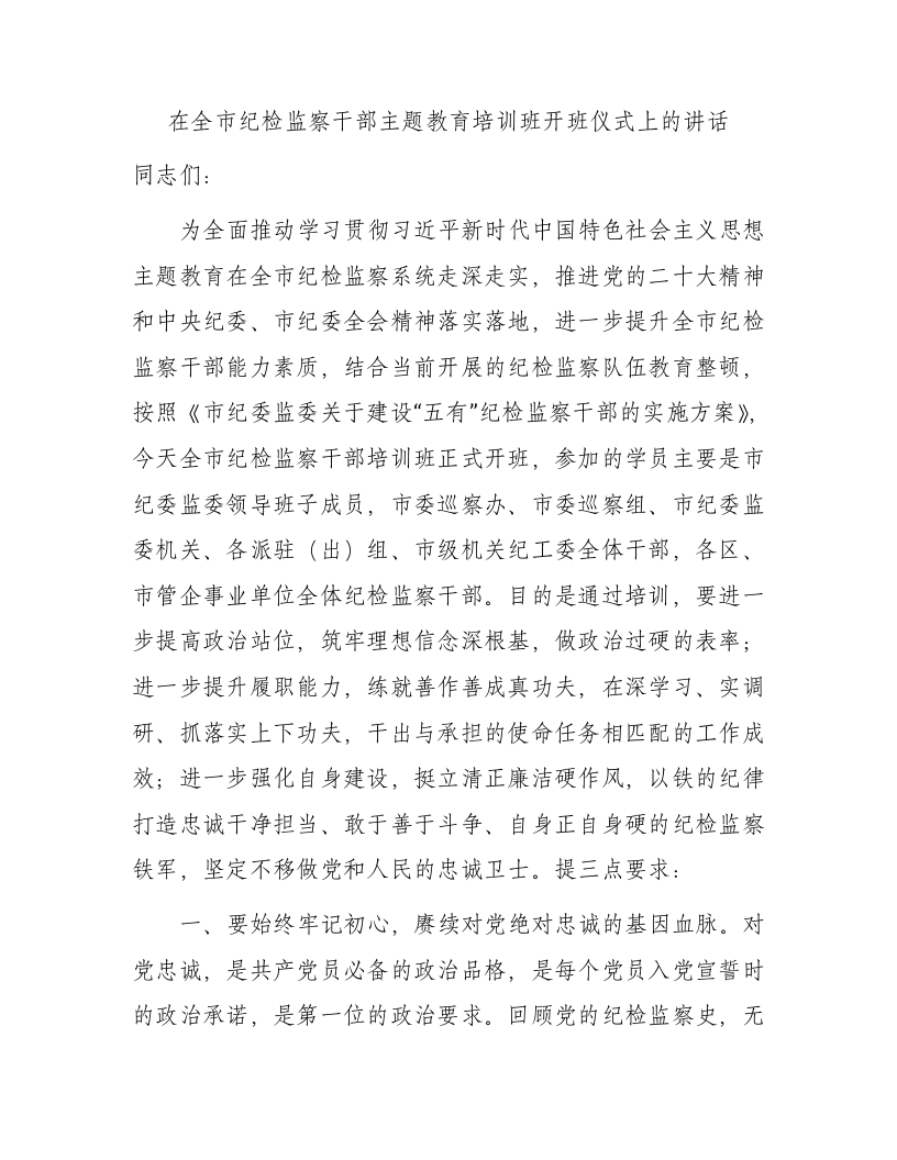 / 在纪检监察干部主题教育培训班开班仪式上的讲话1700字