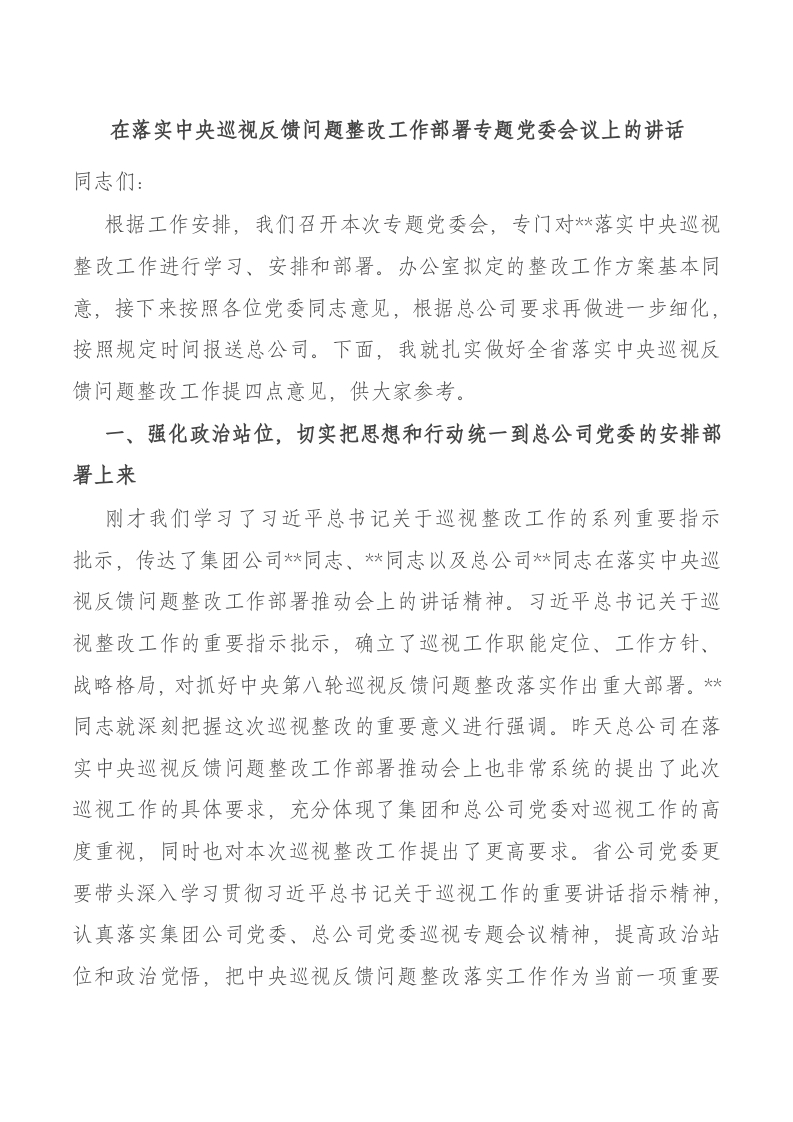 / 在落实中央巡视反馈问题整改工作部署专题党委会议上的讲话