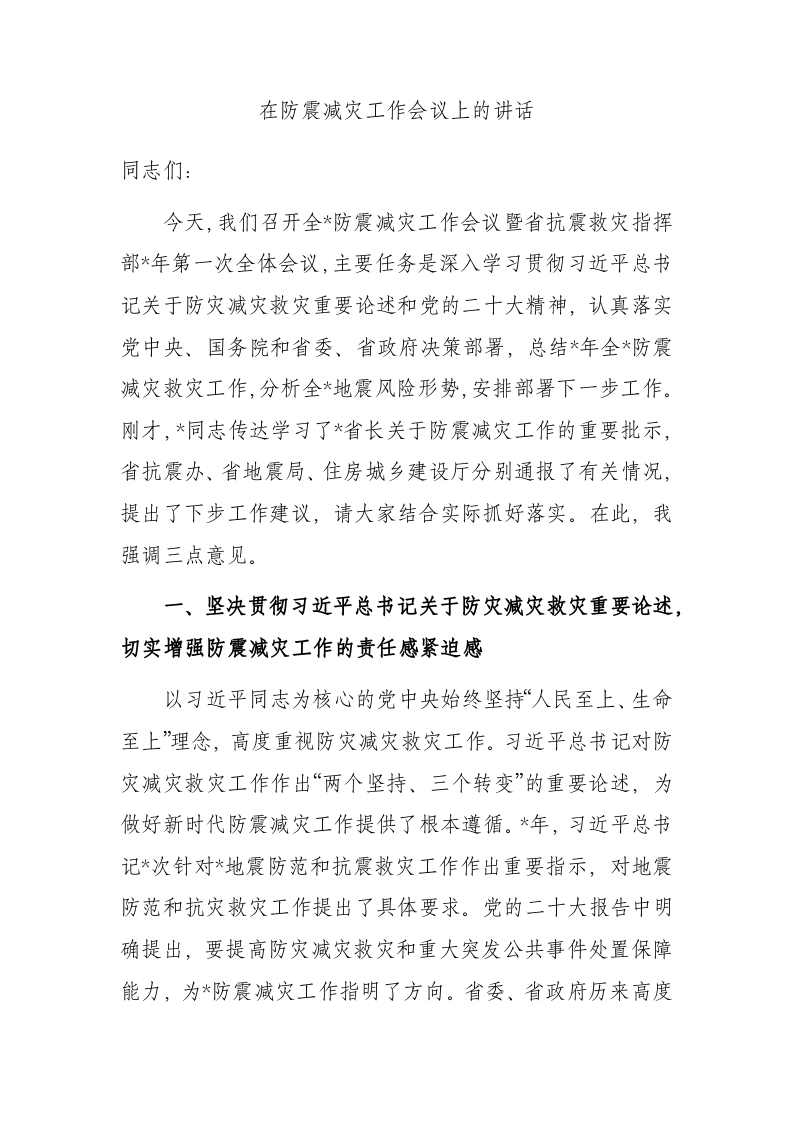 / 在防震减灾工作会议上的讲话