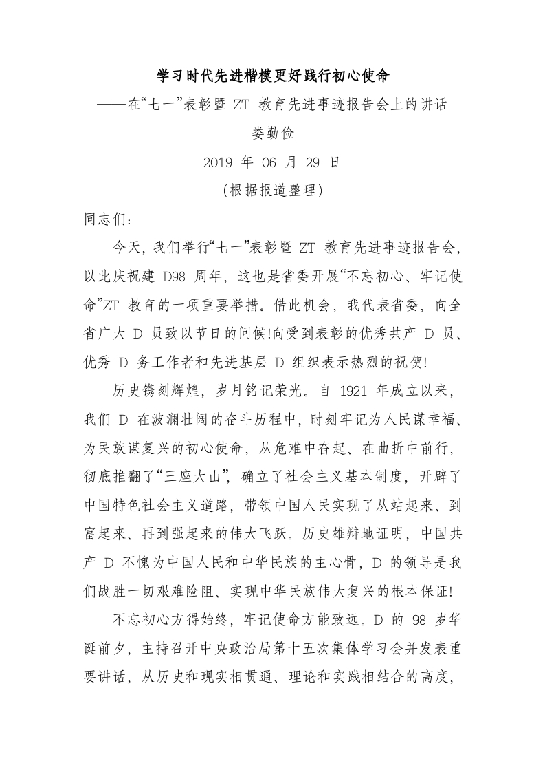 / 娄勤俭:学习时代先进楷模 更好践行初心使命——在七一表彰暨主题教育先进事迹报告会上的讲话