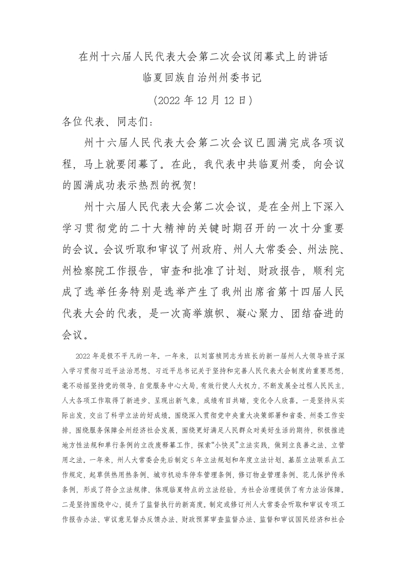 宁夏回族自治州州委书记:在州十六届人民代表大会第二次会议闭幕式上的讲话