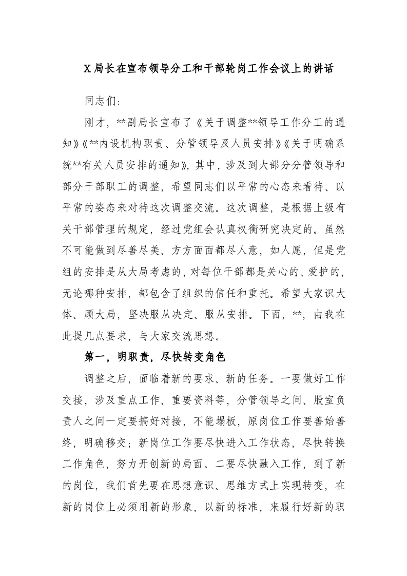 / 局长在宣布领导分工和干部轮岗工作会议上的讲话