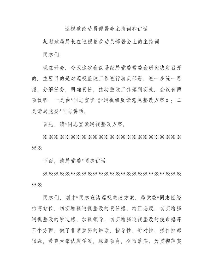 / 巡视整改动员部署会主持词和讲话