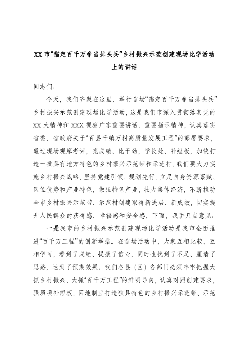/ 市“锚定百千万争当排头兵”乡村振兴示范创建现场比学活动上的讲话