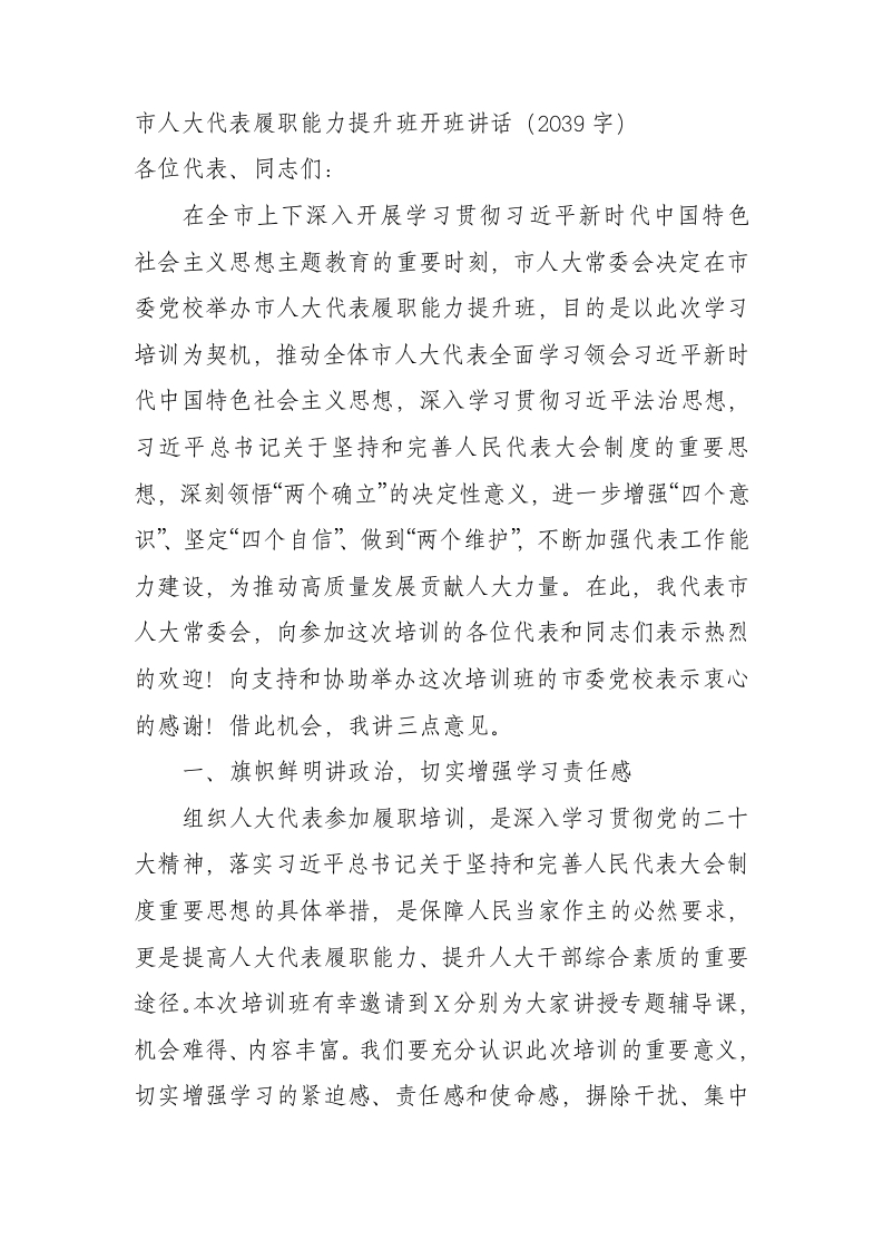 / 市人大代表履职能力提升班开班讲话