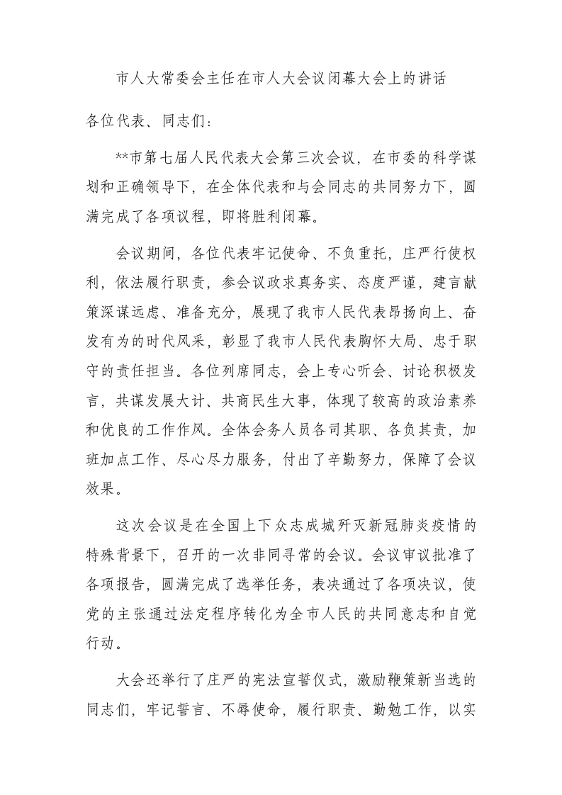 / 市人大常委会主任在市人大会议闭幕大会上的讲话