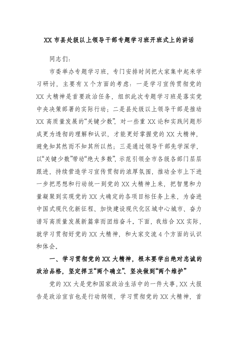 市县处级以上领导干部专题学习班开班式上的讲话