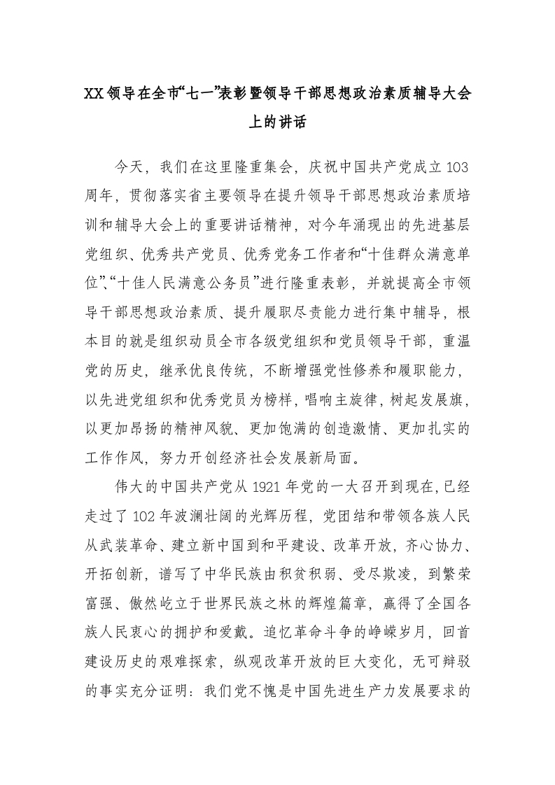 / 领导在全市“七一”表彰暨领导干部思想政治素质辅导大会上的讲话