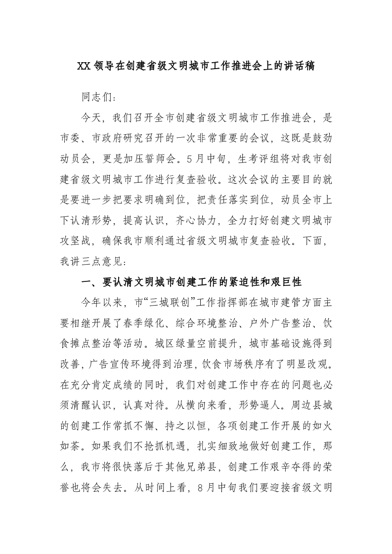 / 领导在创建省级文明城市工作推进会上的讲话稿
