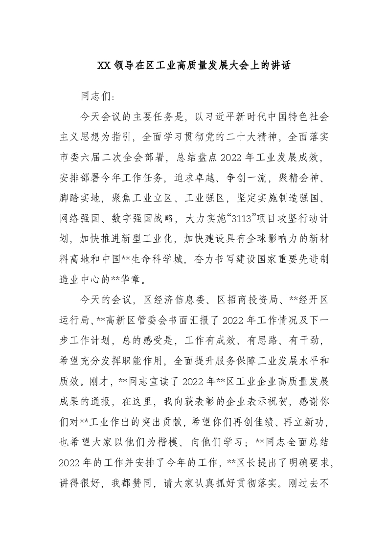 / 领导在区工业高质量发展大会上的讲话
