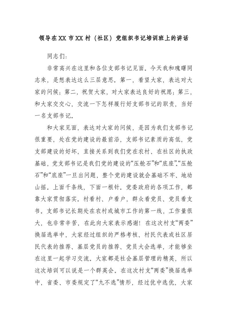 / 领导在市村(社区)党组织书记培训班上的讲话