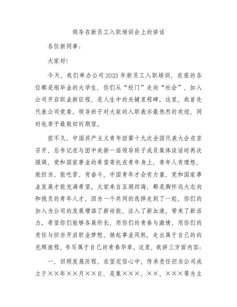/ 领导在新员工入职培训会上的讲话
