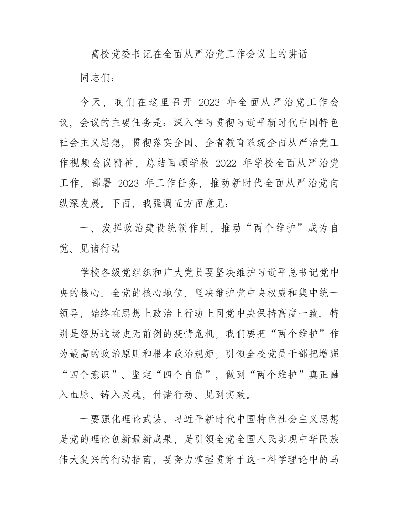 / 高校党委书记在全面从严治党工作会议上的讲话(学校)