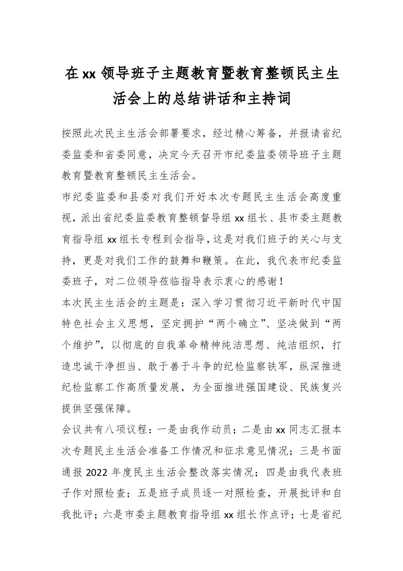 / 在xx领导班子主题教育暨教育整顿民主生活会上的总结讲话稿和主持词