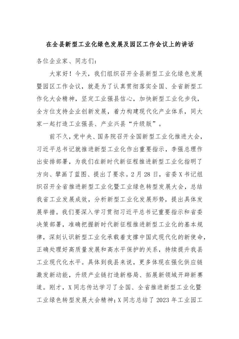 / 在全县新型工业化绿色发展及园区工作会议上的讲话稿
