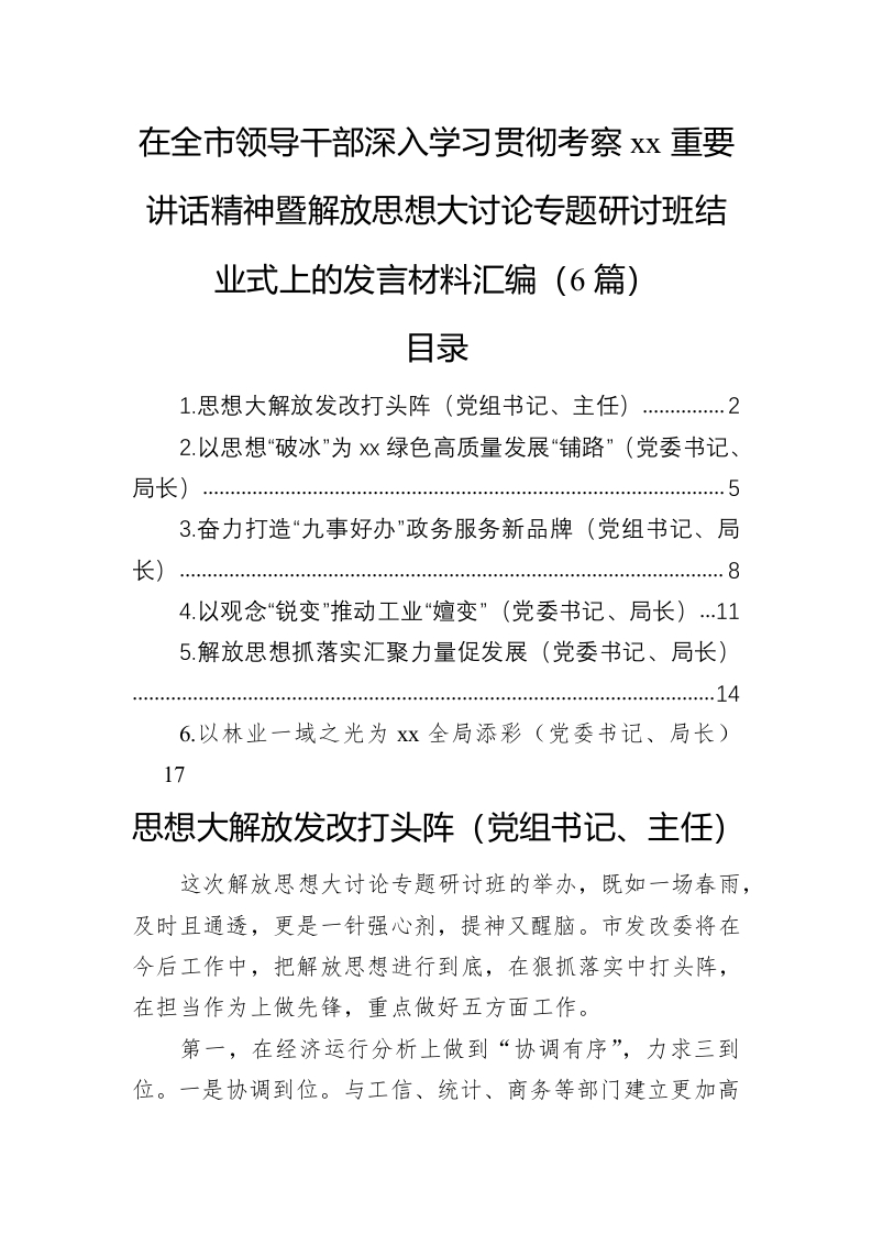 / 在全市领导干部深入学习贯彻考察xx重要讲话稿精神暨解放思想大讨论专题研讨班结业式上的发言稿材料汇编(6篇)