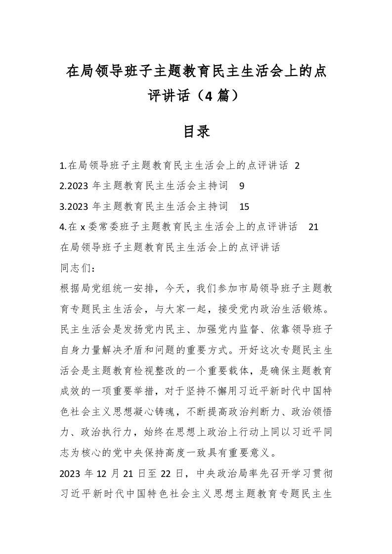 / (4篇)在局领导班子主题教育民主生活会上的点评讲话稿