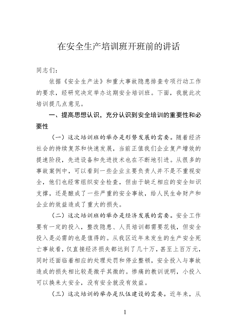 / 在安全生产培训班开班前的讲话