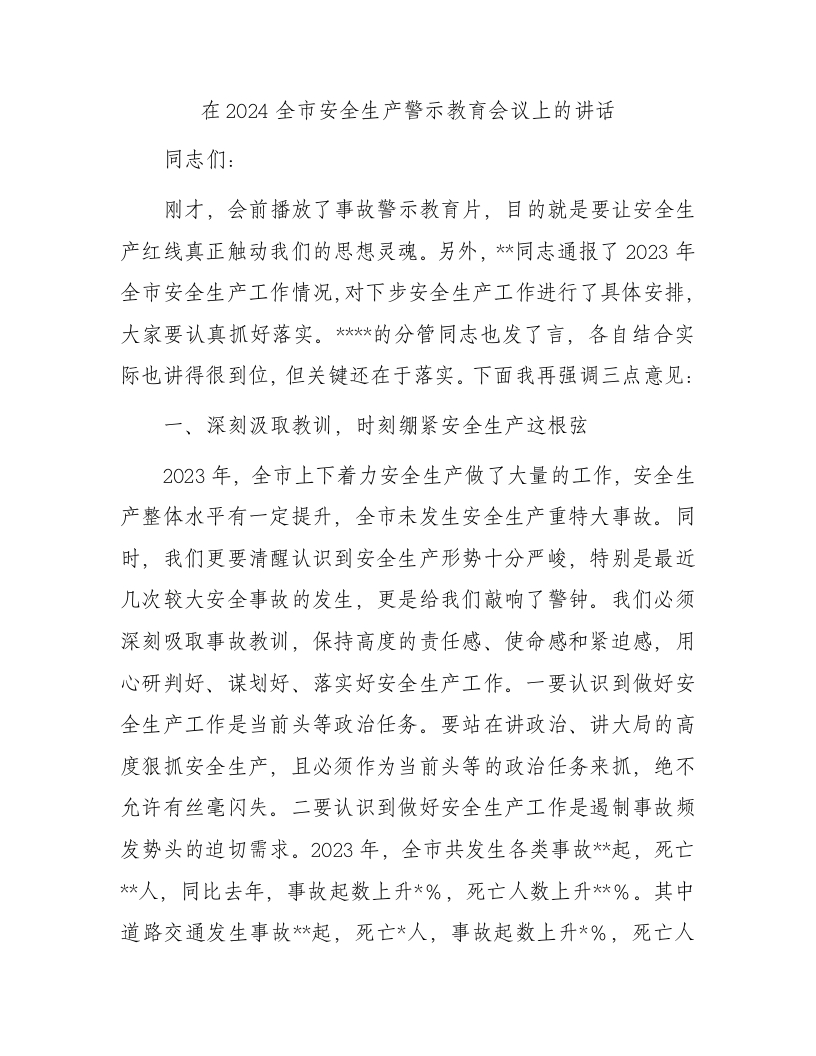 / 在2024全市安全生产警示教育会议上的讲话