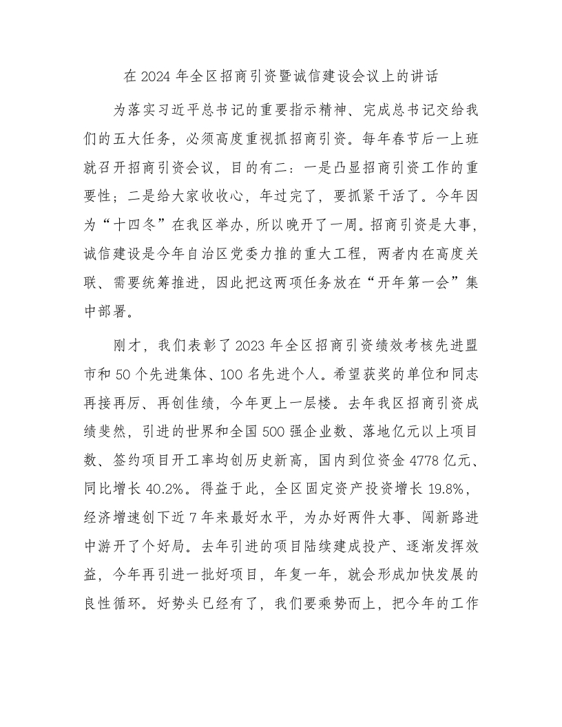 / 在2024年全区招商引资暨诚信建设会议上的讲话