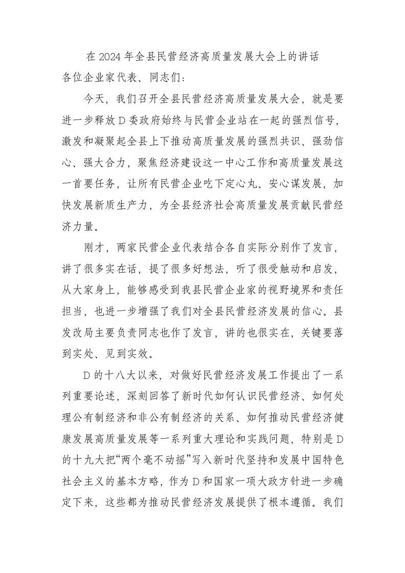 / 在2024年全县民营经济高质量发展大会上的讲话