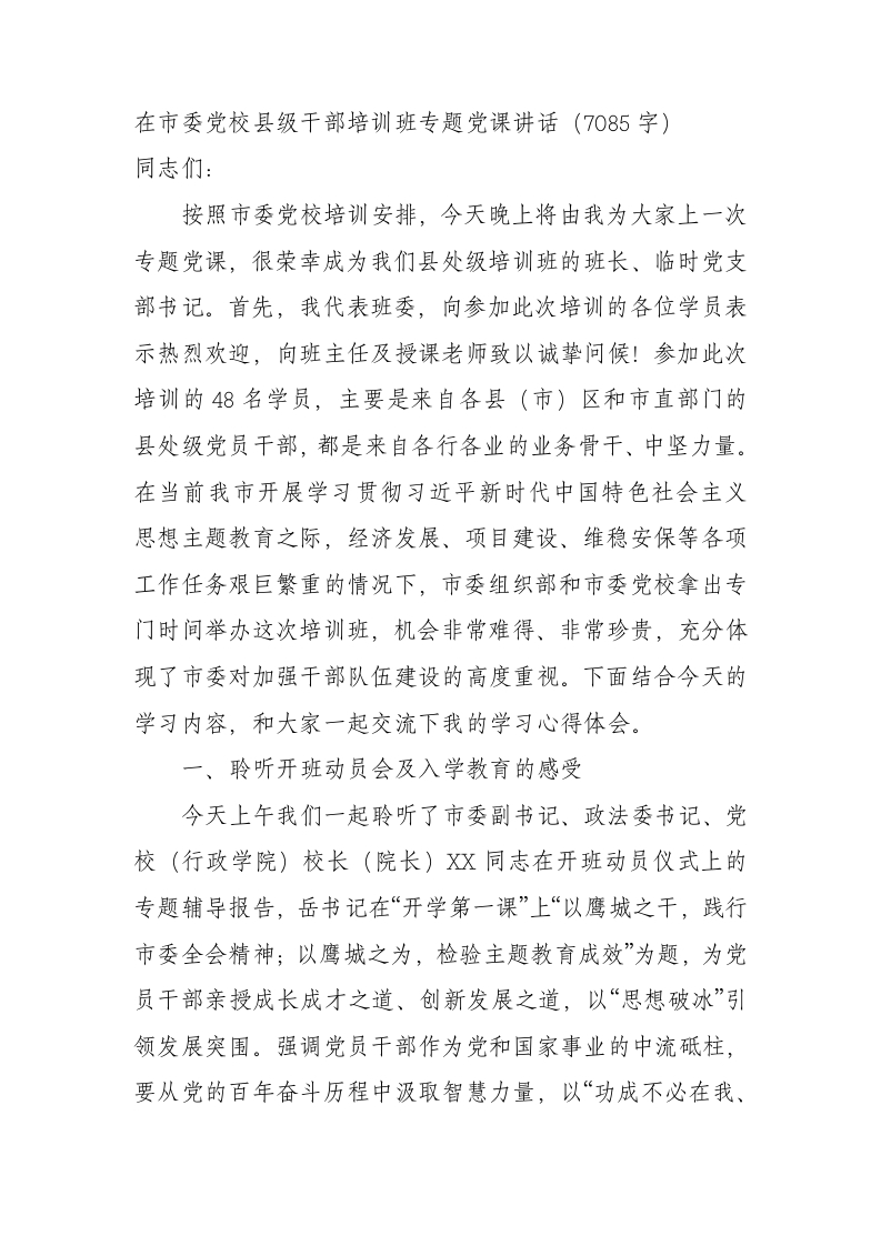 / 在市委党校县级干部培训班专题党课讲话
