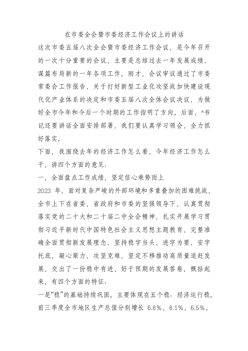 / 在市委全会暨市委经济工作会议上的讲话
