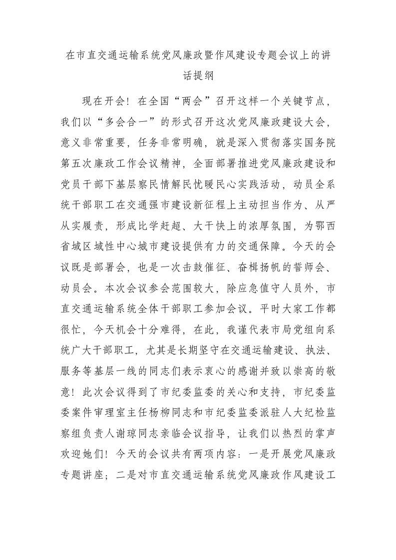 在市直交通运输系统党风廉政暨作风建设专题会议上的讲话提纲