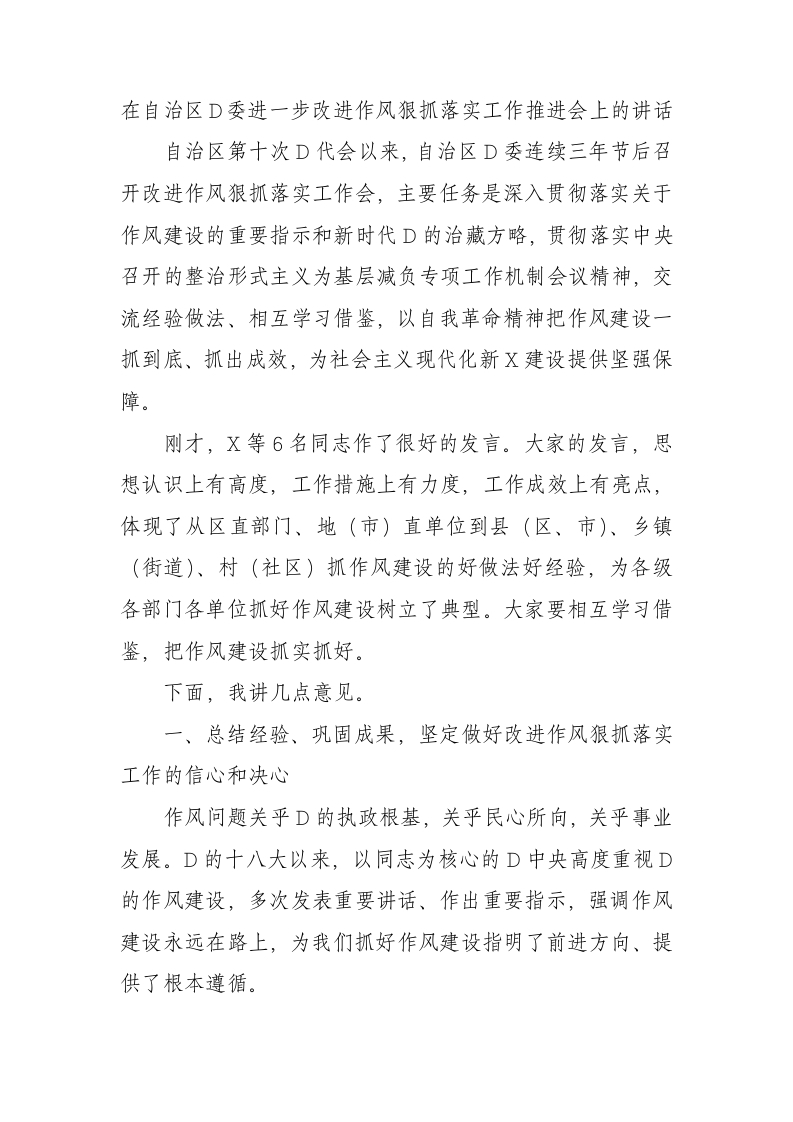 / 在自治区党委进一步改进作风狠抓落实工作推进会上的讲话