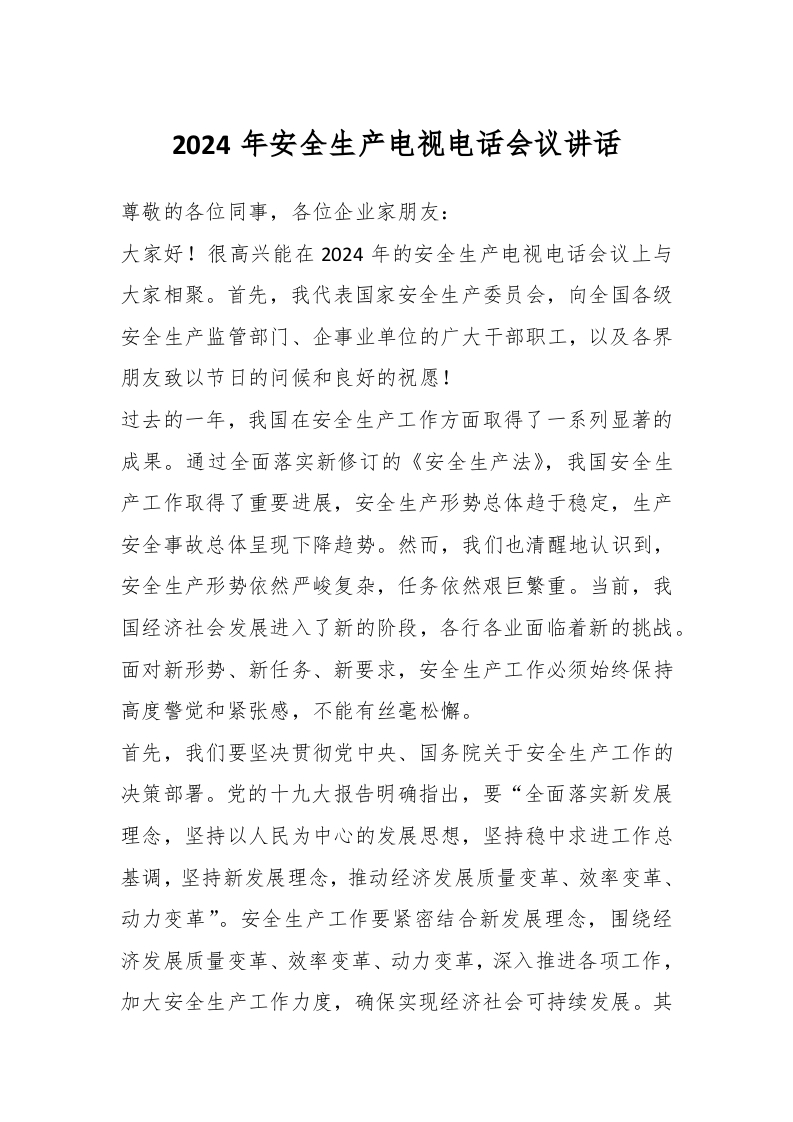 / 2024年安全生产电视电话会议讲话稿