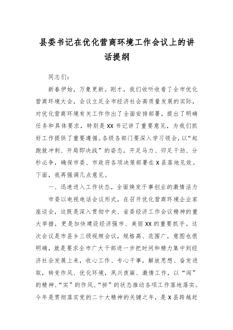 / 县委书记在优化营商环境工作会议上的讲话稿提纲